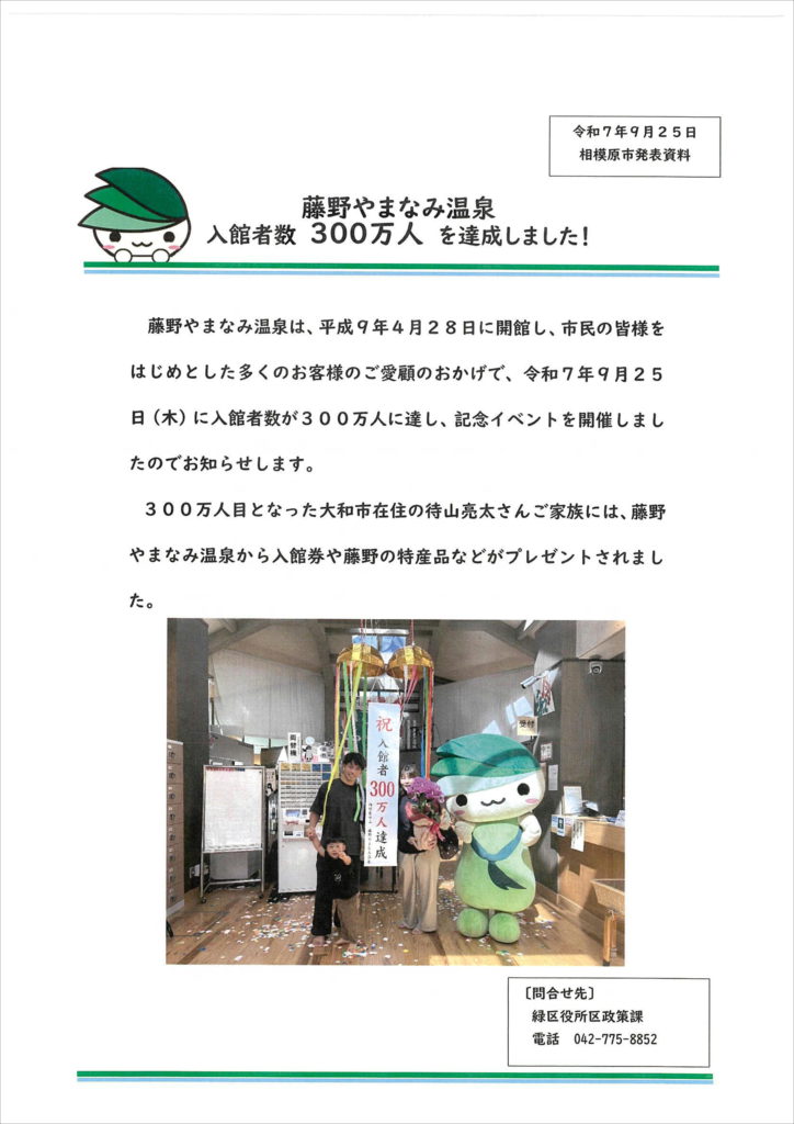 平成9年(1997)4月に開館して、多くのお客さまのご愛顧により、300万人に達成しました。
