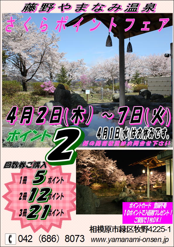 さくらポイントフェア 4/2~4/7 2026年4月2日 お知らせ by やまなみ温泉. 4月2日(木)~7日(火)さくらポイントフェアを開催します。4月1日(水)はお休みです。 期間中ポイント2個付きます。 回数券ご購入でポイントたくさん付きます。 回数券1冊購入で5ポイント、2冊で12ポイント、3冊で21ポイント ポイントが10個で、入館券をプレゼント! ポイントカードは、登録不要ですぐ発行できます。 前の記事