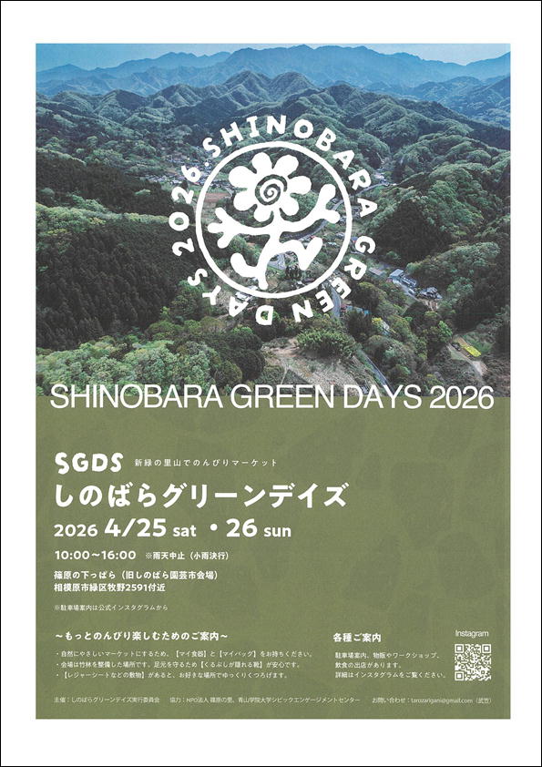 藤野イベント情報 4/25.26しのばらグリーンディズ 2026年4月24日 お知らせ by やまなみ温泉. 藤野イベント情報 SDGSしのばらグリーンディズ2026 4月25日(土) 26日(日)10:00~16:00 相模原市緑区牧野2591付近 前の記事